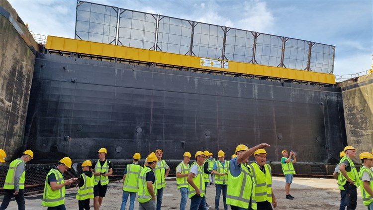 Na de presentatie kregen we een rondleiding door de verschillende reparatiehallen en uiteindelijk ook buiten op de werf, over het best wel grote terrein. Hier lagen diverse schepen in hun eigen droogdok: enorme schepen waar we omheen liepen of zelfs eronder. Eenieder was ervan onder de indruk.